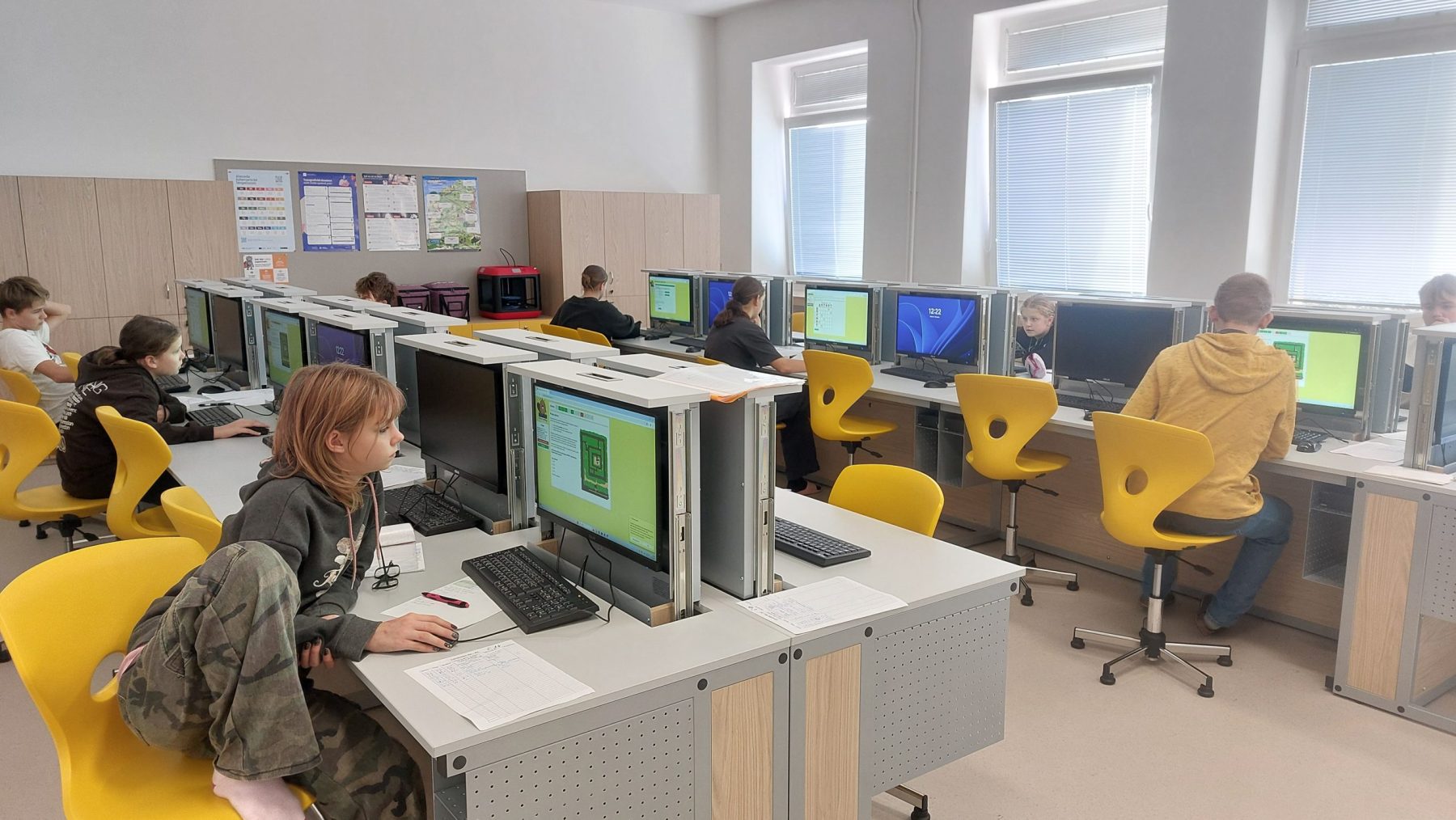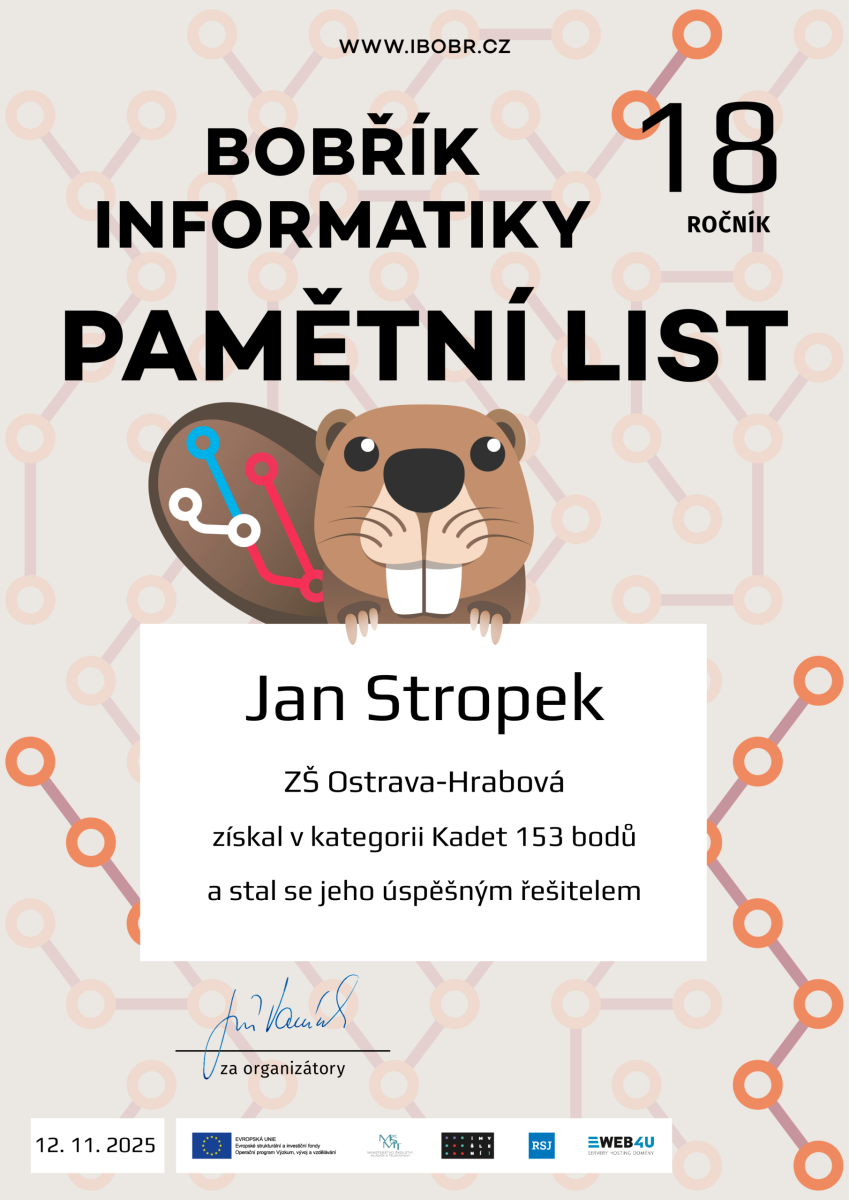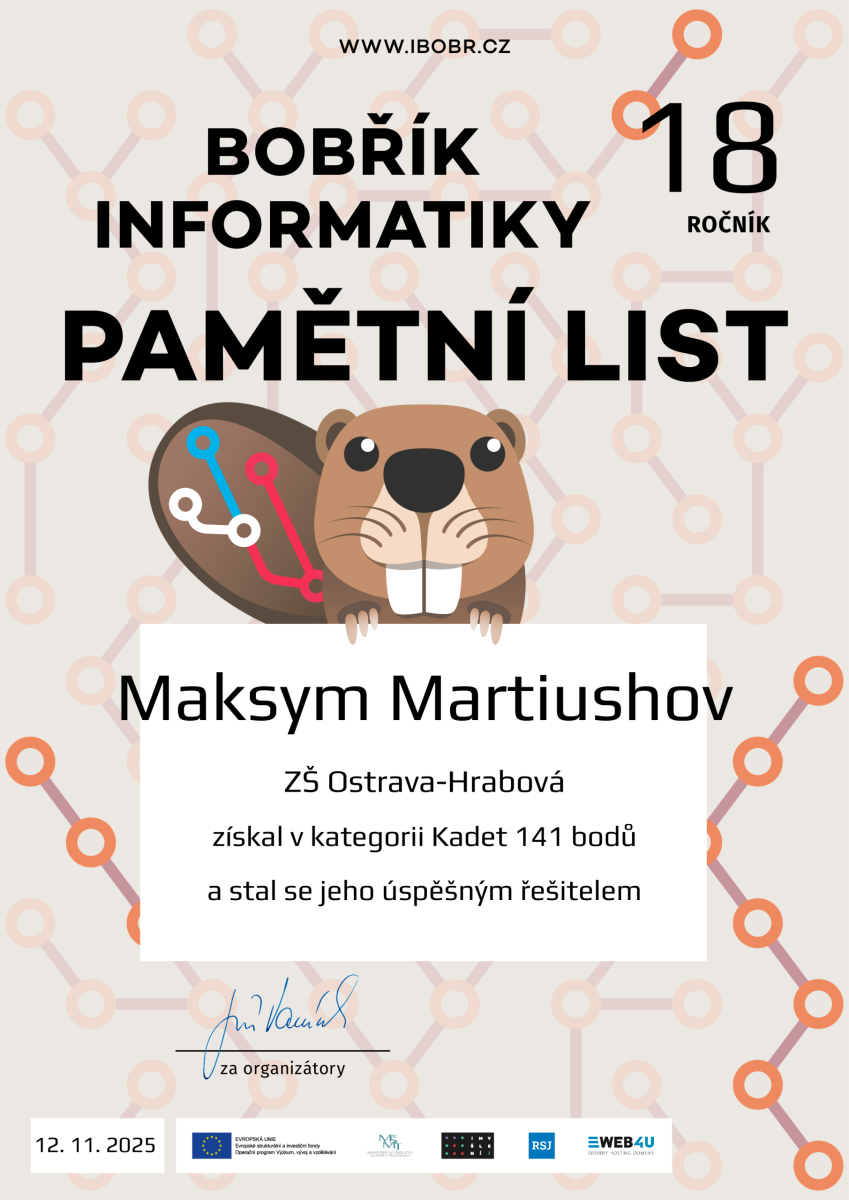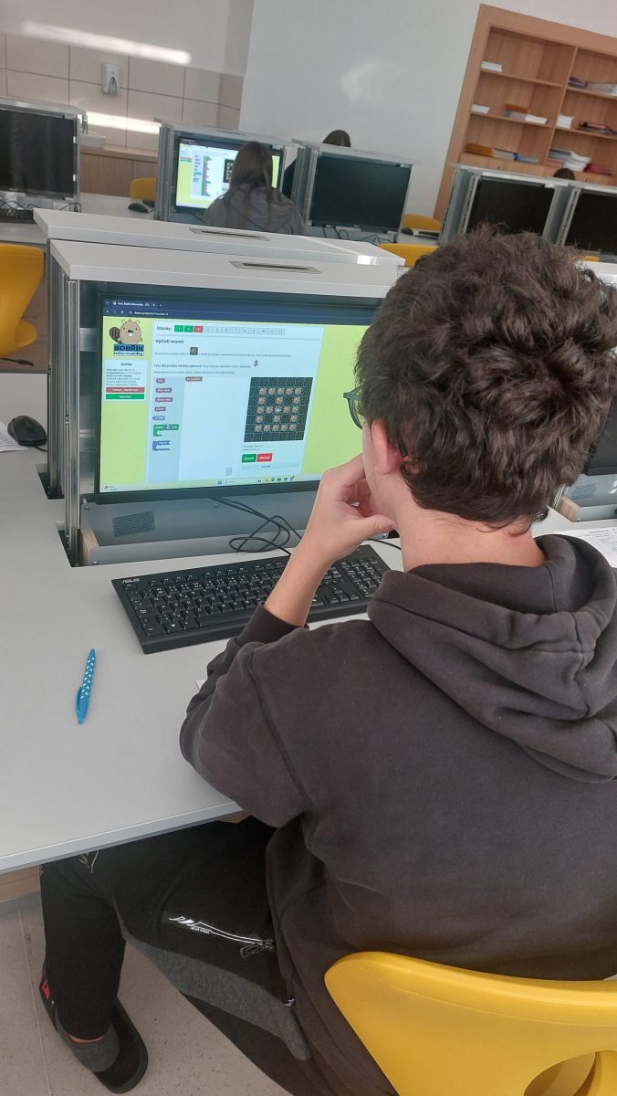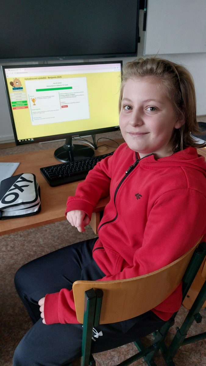 Ve dnech od 3. 11. do 14. 11. 2025 se žáci 4. – 9. ročníku zapojili do celonárodní soutěže Bobřík informatiky. Soutěže se zúčastnilo z naší školy celkem 197 žáků v jednotlivých kategoriích. Žáci na počítačích odpovídali na otázky z oblasti informatického myšlení, algoritmizace, porozumění informacím, práce s daty, informačním systémům a modelování, z oblasti digitálních technologií. Postupně vyplňovali online test, vybírali z několika odpovědí, přemísťovali objekty na obrazovce, sestavovali program z bloků apod.