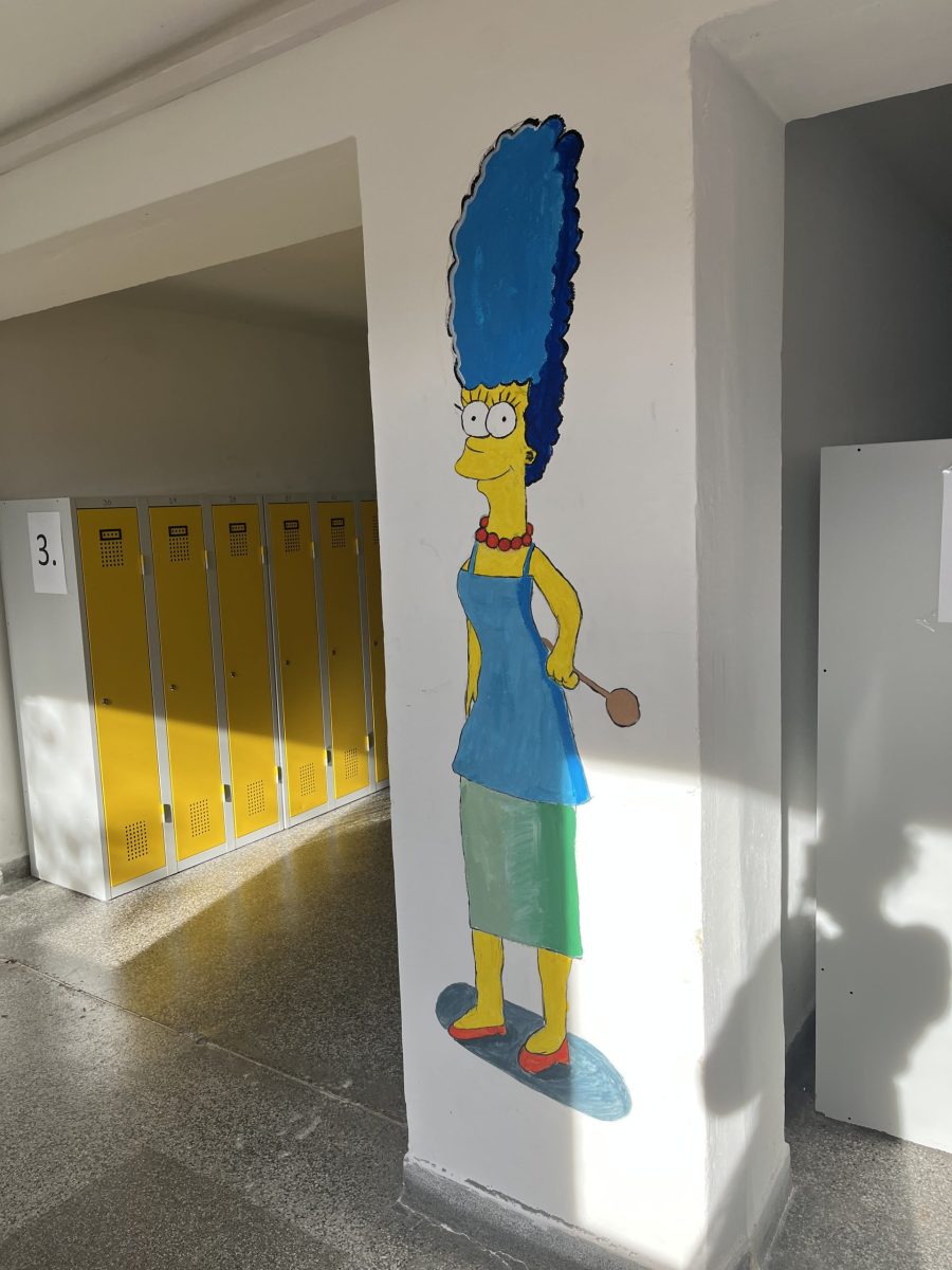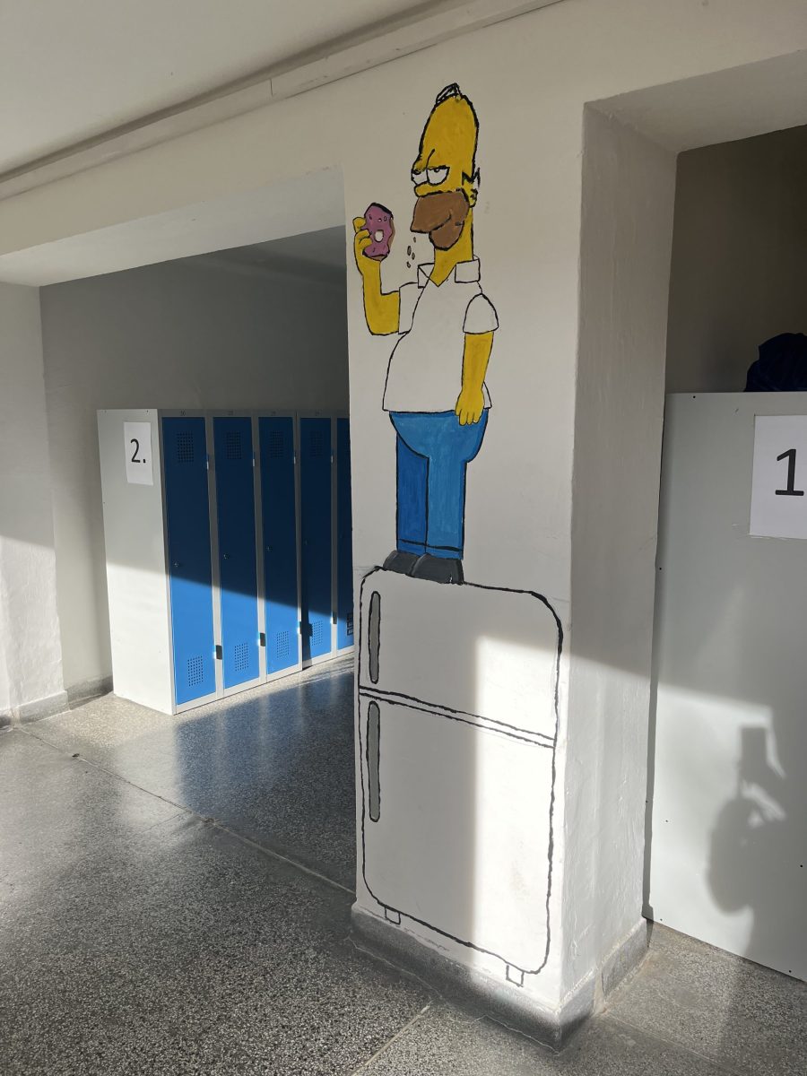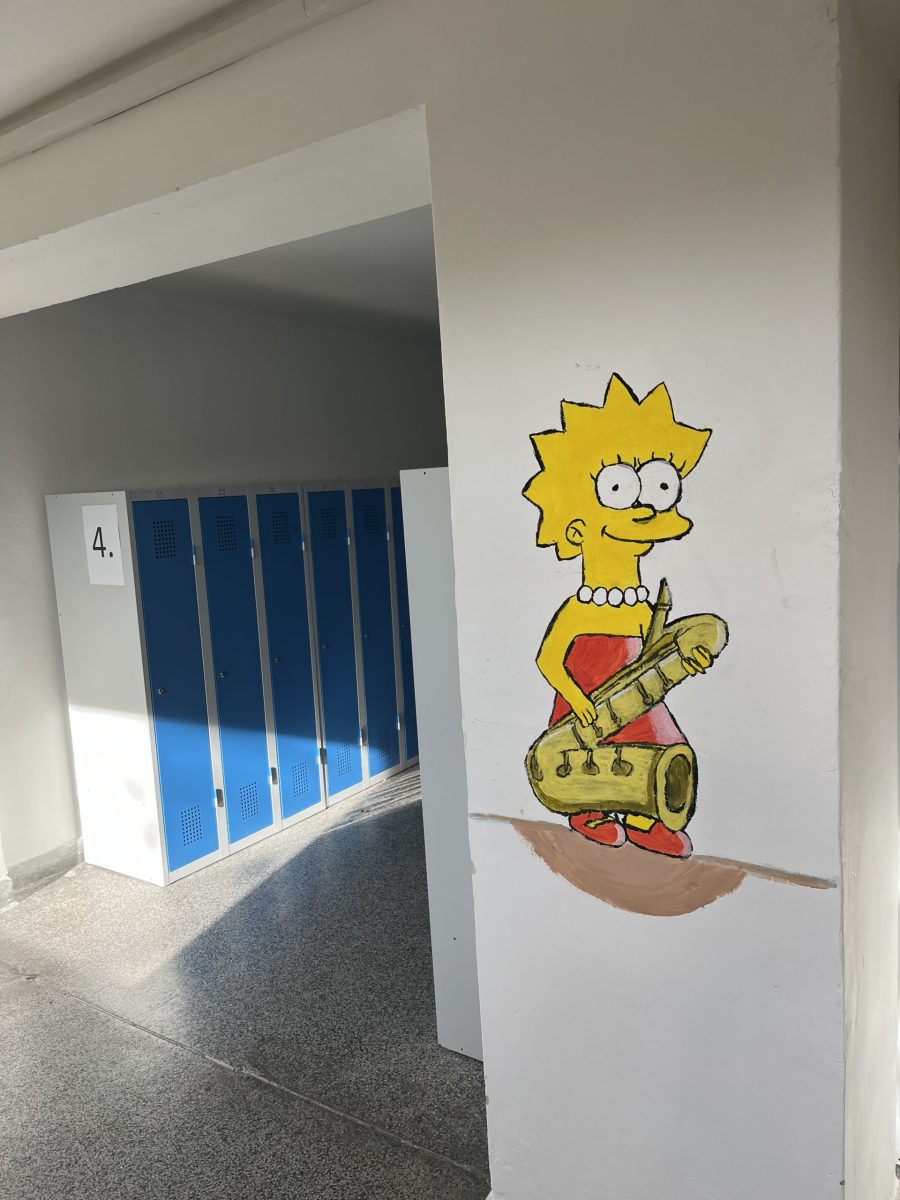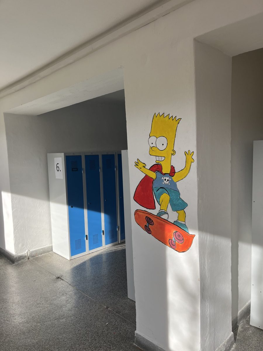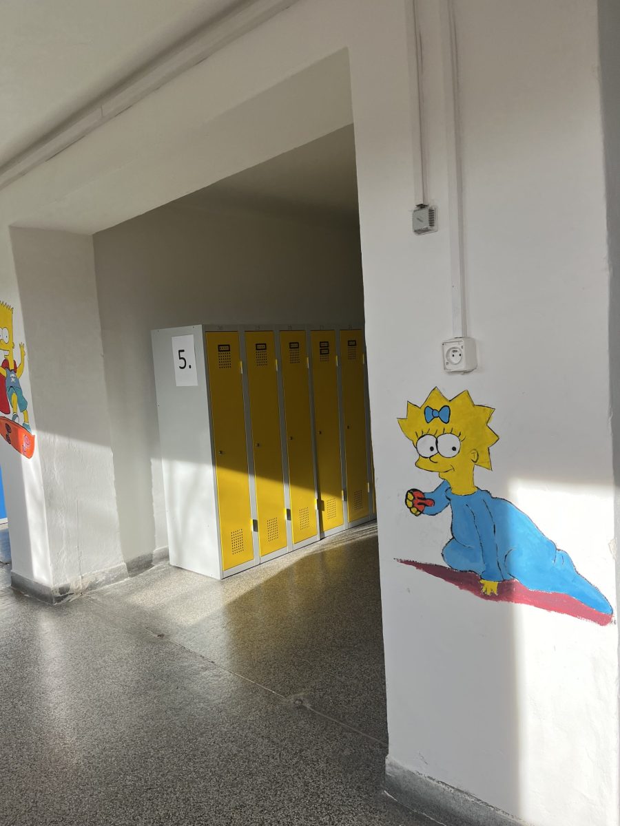 Šatny druhého stupně ožily barvami a humorem! Žáci sedmých ročníků se totiž v hodinách výtvarné výchovy pustili do velkého projektu – vyzdobit zdi motivem známé animované rodiny Simpsonových.