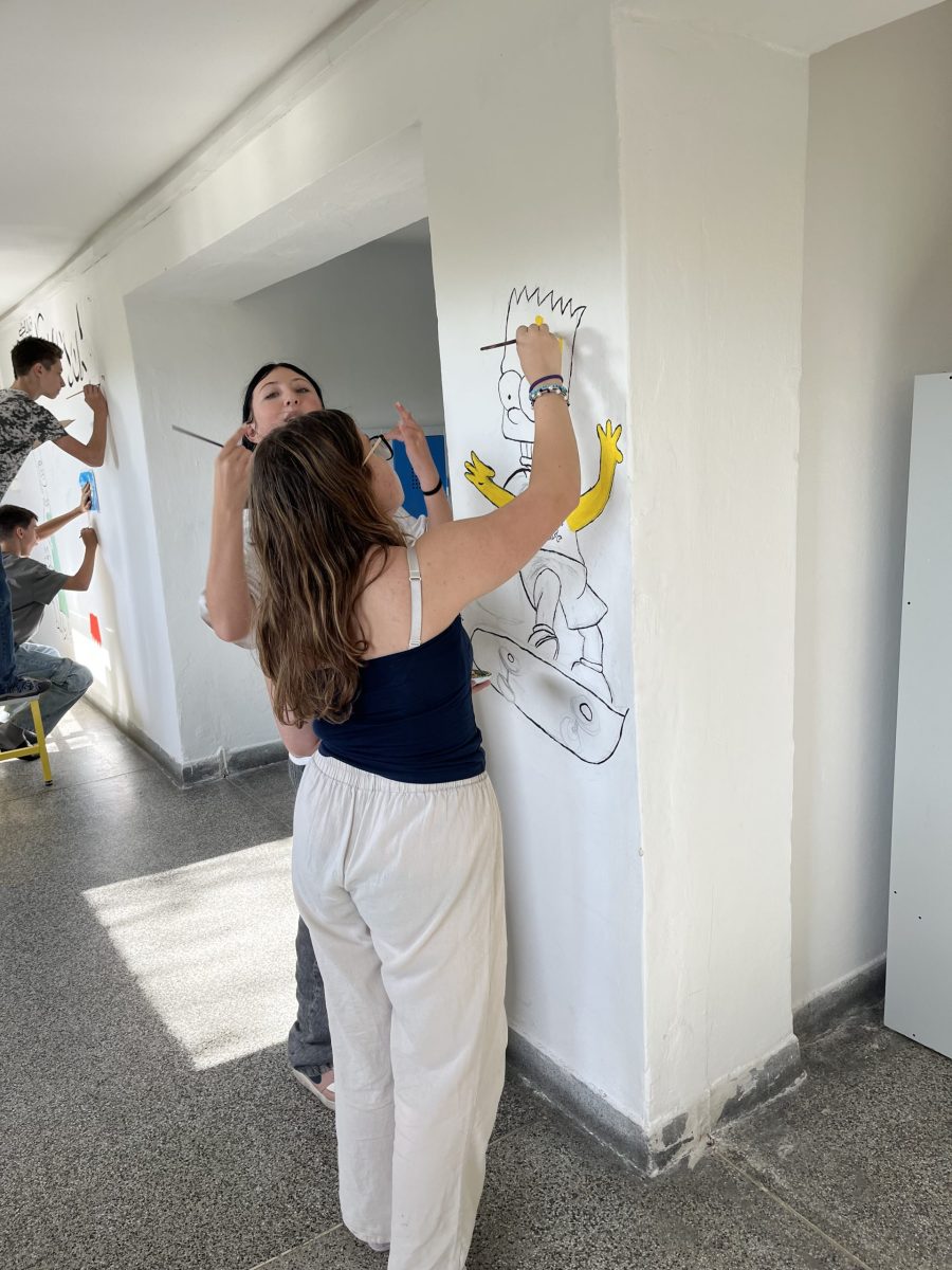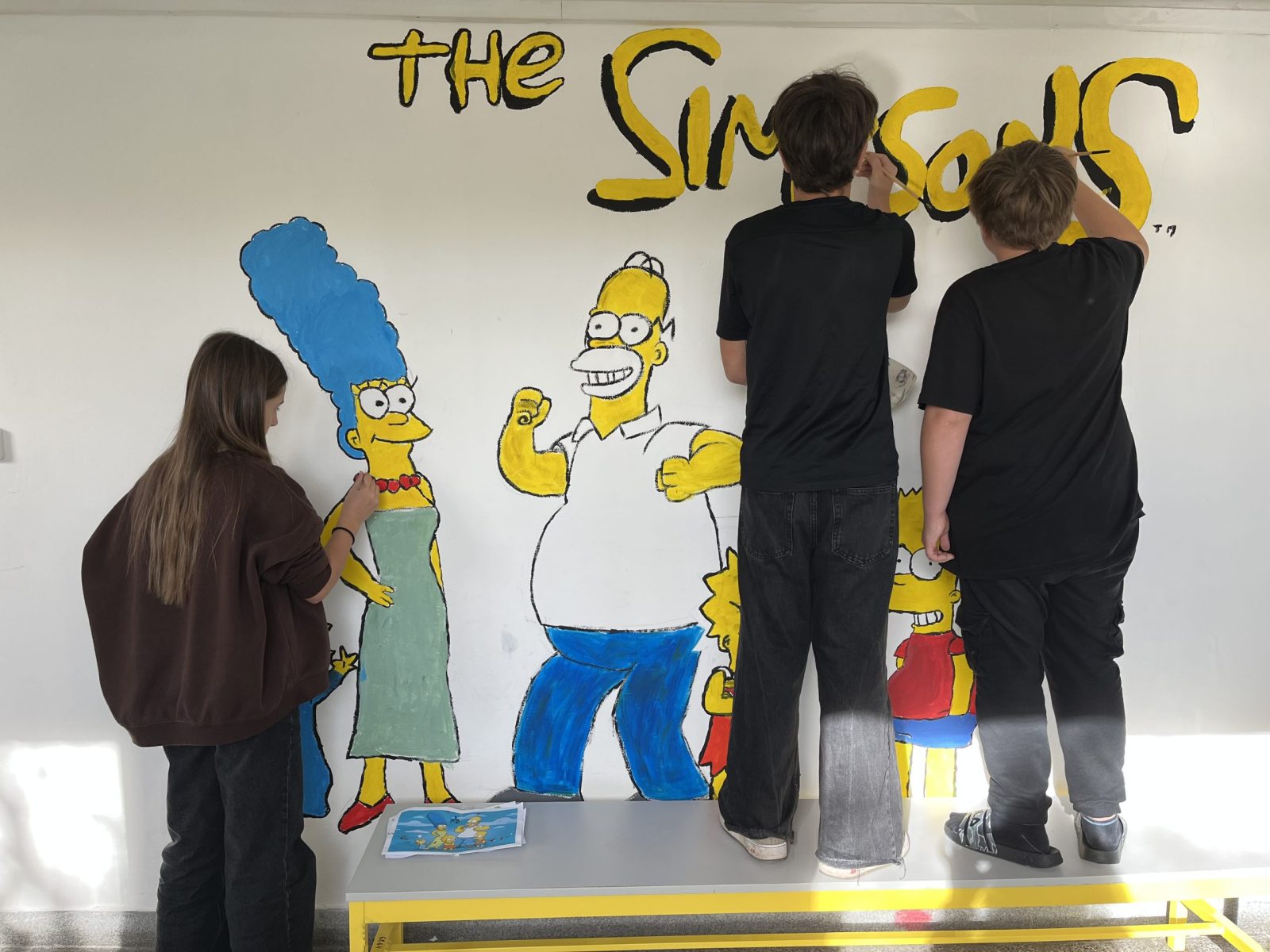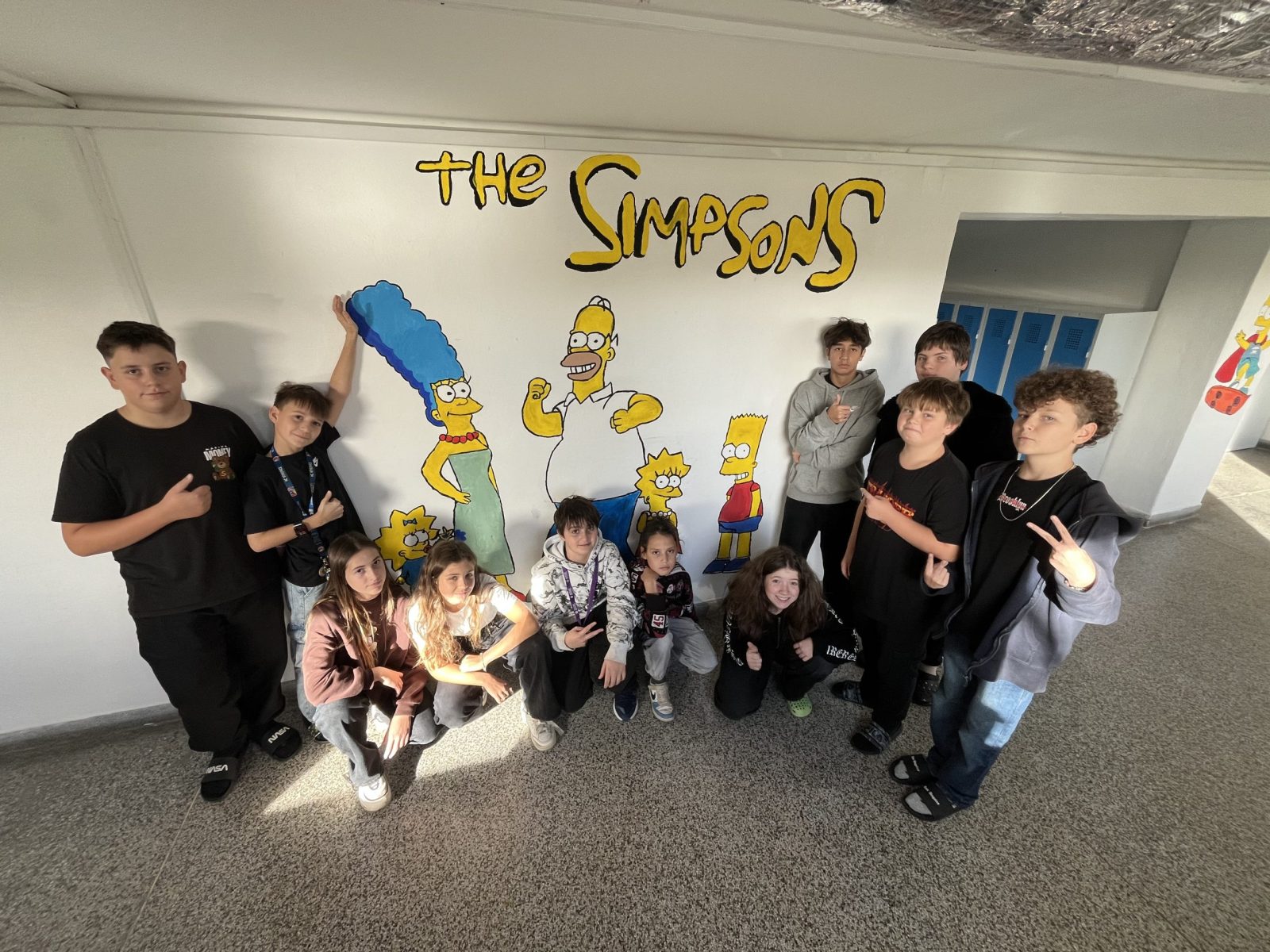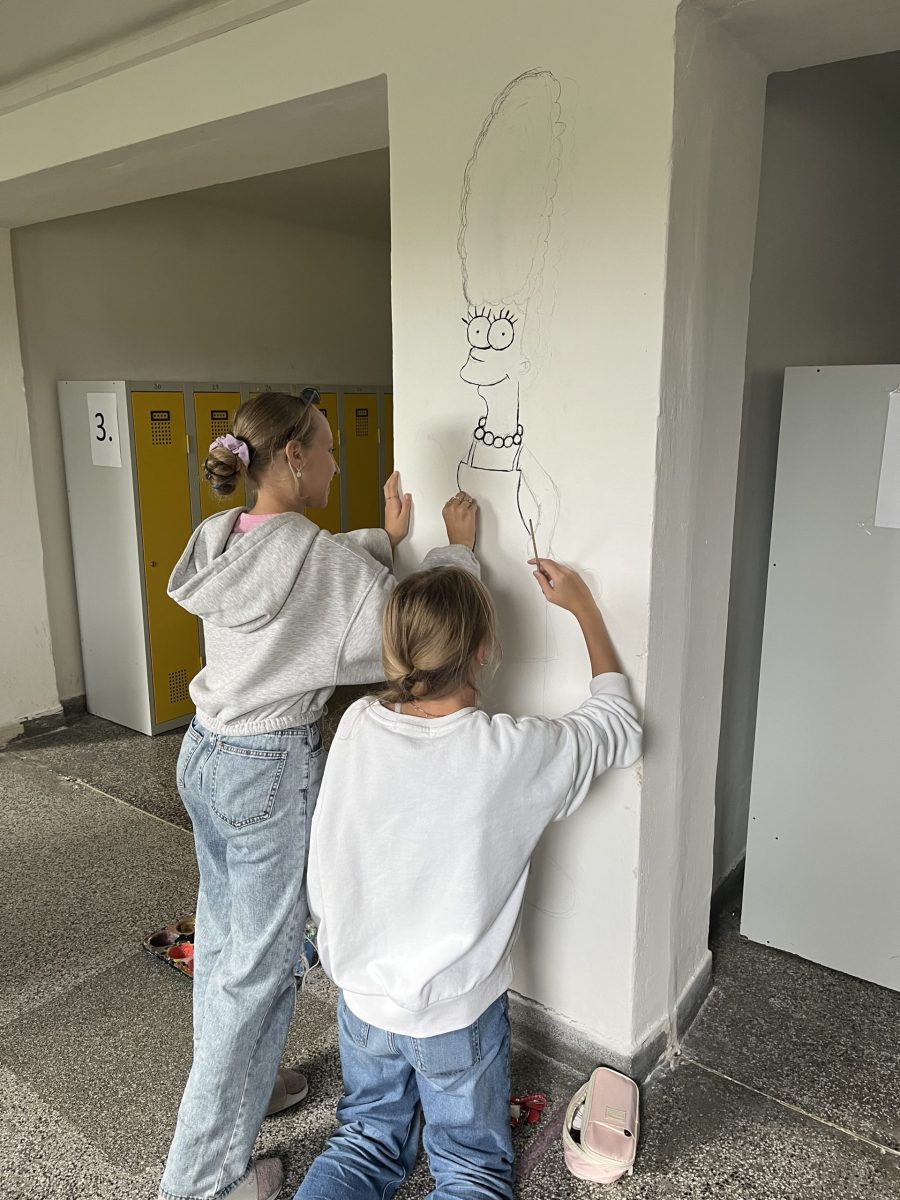 Šatny druhého stupně ožily barvami a humorem! Žáci sedmých ročníků se totiž v hodinách výtvarné výchovy pustili do velkého projektu – vyzdobit zdi motivem známé animované rodiny Simpsonových.