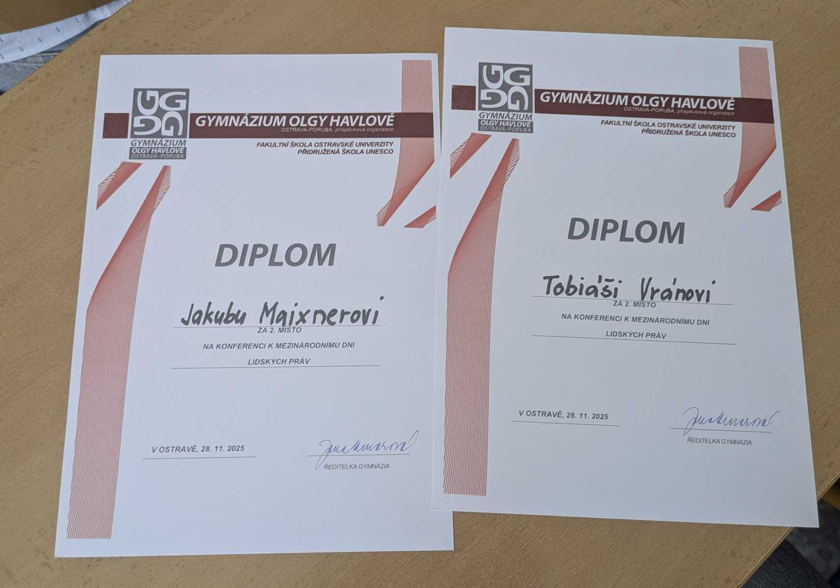 I letos jsme se zúčastnili již 14. ročníku společenskovědní soutěže, kterou pořádá Gymnázium Olgy Havlové v Ostravě – Porubě k Mezinárodnímu dni lidských práv. Dvojice žáků IX. A třídy Jakub Maixner a Tobiáš Vrána se utkala v rámci představení vlastní prezentace s týmy jiných ostravských základních škol a gymnázií a v kategorii základních škol obsadili skvělé druhé místo. Téma letošní prezentace bylo Migrace v našem kraji – Jak to vidíme v našem regionu. Oběma našim žákům děkujeme za vynikající reprezentaci naší školy.