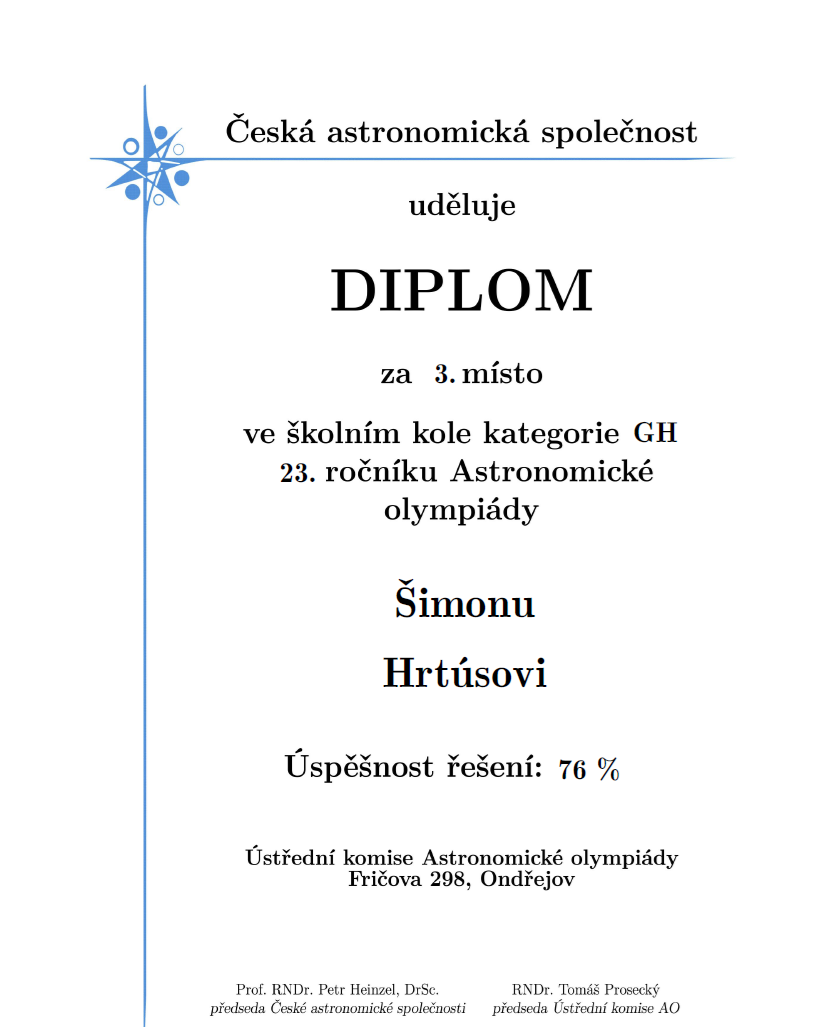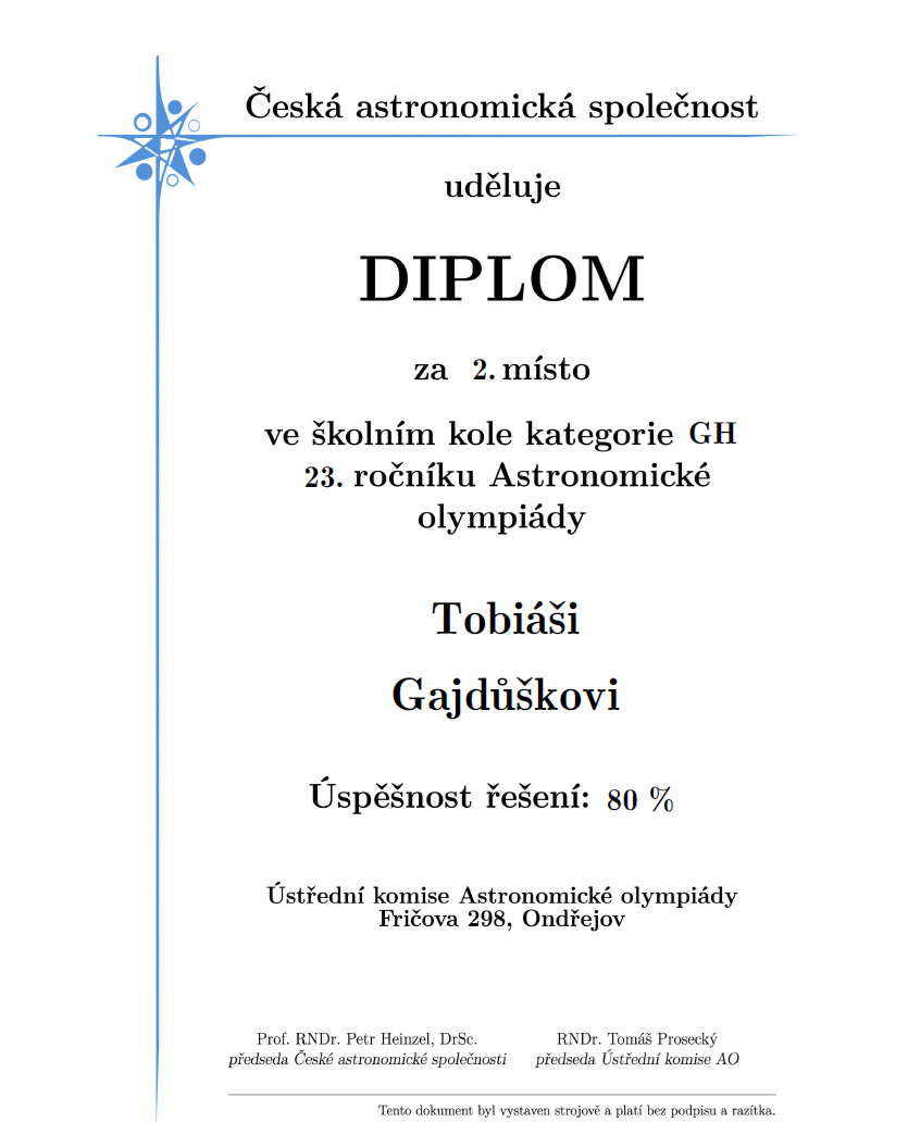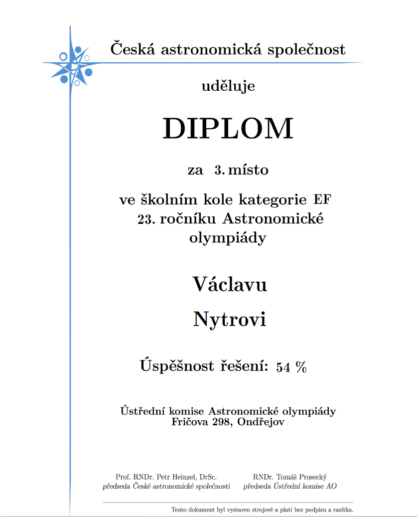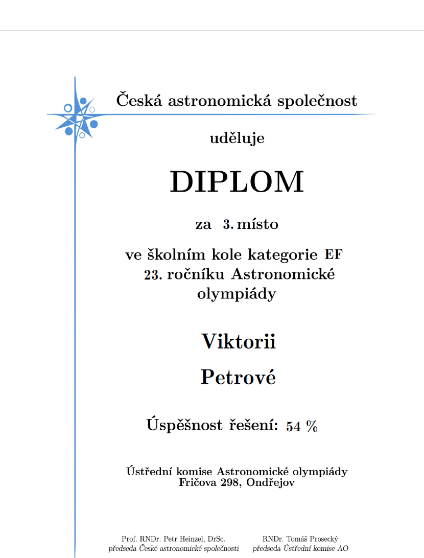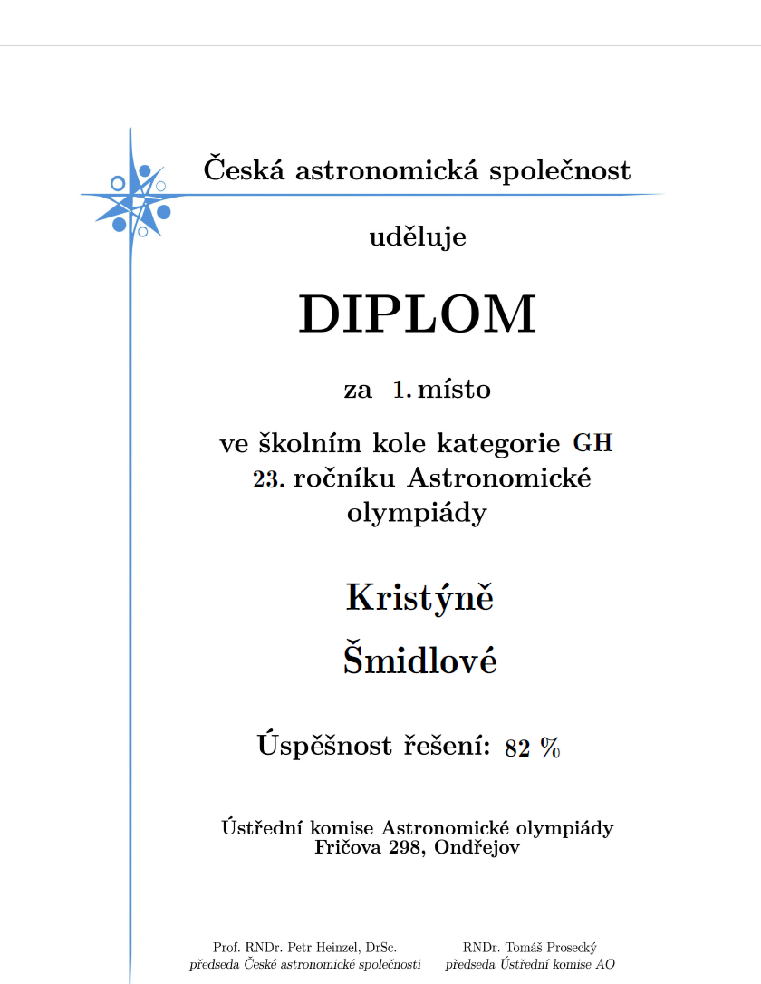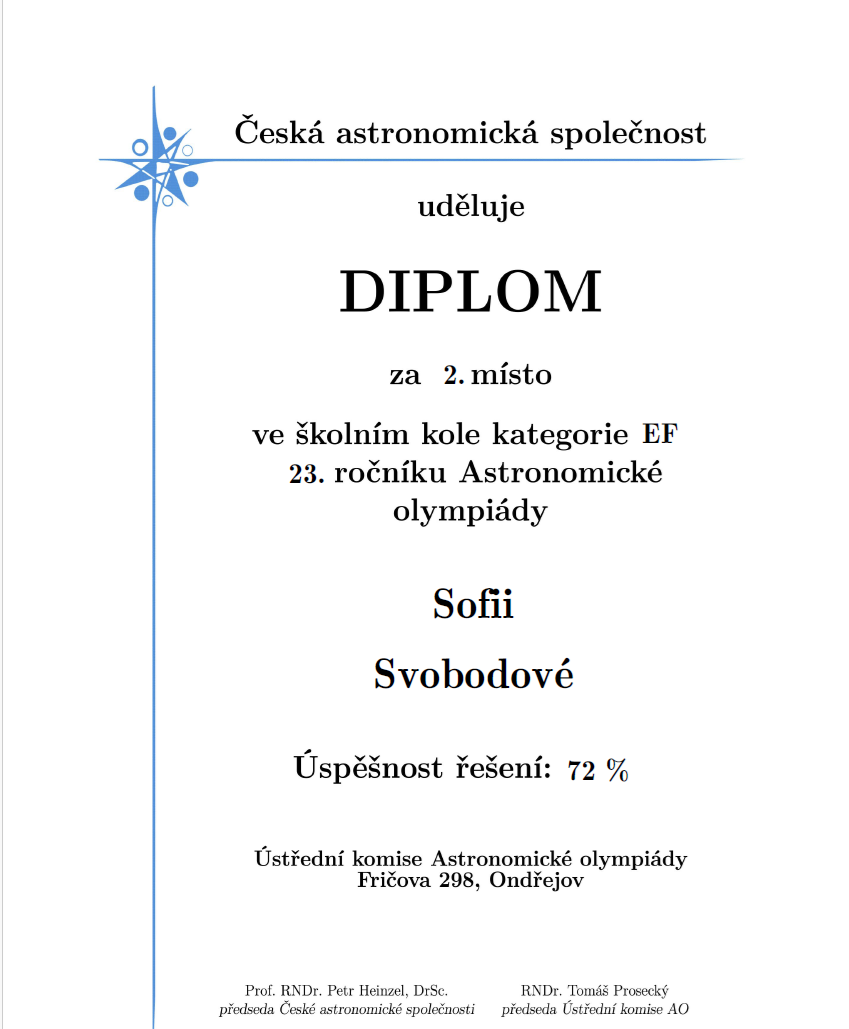 V týdnu od 3. – 10. 12. 2025 proběhlo na naší škole školní kolo Astronomické olympiády. Jedná se o předmětovou soutěž z oboru astronomie a příbuzných oborů.